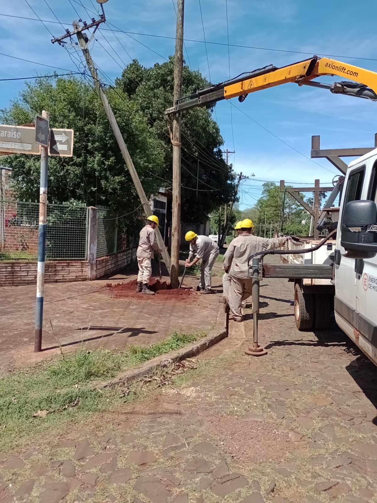 En el barrio Almirante Brown, las tareas se desarrollaron sobre la calle Peteribí, entre Palo Rosa y Laurel, donde se concretó el reemplazo de dos postes de hormigón de media tensión y cuatro de baja tensión, además de la instalación de nuevas crucetas y la realización de poda preventiva.